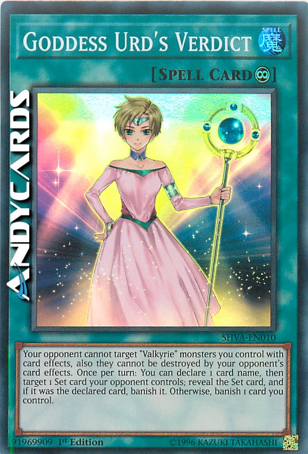 Il tuo avversario non può scegliere come bersaglio i mostri "Valkyria-" che controlli con gli effetti delle carte, inoltre essi non possono essere distrutti dagli effetti delle carte del tuo avversario. Una volta per turno: puoi dichiarare il nome di 1 carta, poi scegliere come bersaglio 1 carta Posizionata controllata dal tuo avversario; rivela la carta Posizionata e, se era la carta dichiarata, bandiscila. Altrimenti, bandisci 1 carta che controlli.