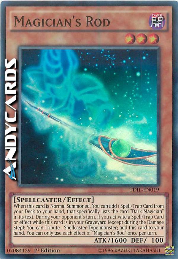 When this card is Normal Summoned: You can add 1 Spell/Trap from your Deck to your hand, that specifically lists the card "Dark Magician" in its text. During your opponent's turn, if you activate a Spell/Trap Card or effect while this card is in your GY (except during the Damage Step): You can Tribute 1 Spellcaster monster; add this card to your hand. You can only use each effect of "Magician's Rod" once per turn.