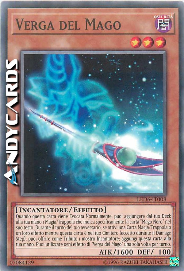 Quando questa carta viene Evocata Normalmente: puoi aggiungere dal tuo Deck alla tua mano 1 Magia/Trappola che indica specificamente la carta "Mago Nero" nel suo testo. Durante il turno del tuo avversario, se attivi una Carta Magia/Trappola o un loro effetto mentre questa carta è nel tuo Cimitero (eccetto durante il Damage Step): puoi offrire come Tributo 1 mostro Incantatore; aggiungi questa carta alla tua mano. Puoi utilizzare ogni effetto di "Verga del Mago" una sola volta per turno.