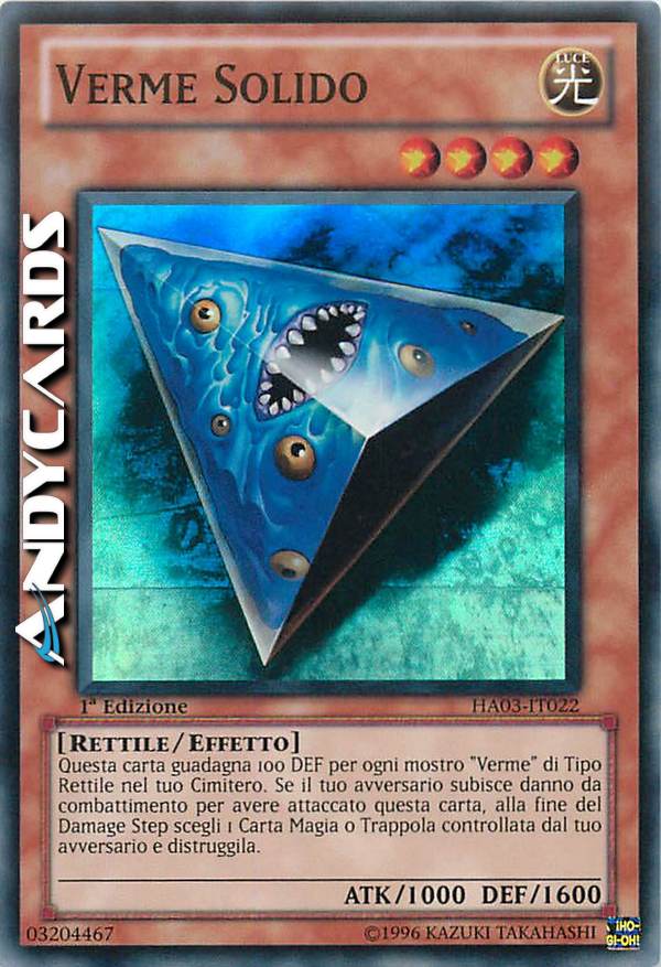 Questa carta guadagna 100 DEF per ogni mostro "Verme" di Tipo Rettile nel tuo Cimitero. Se il tuo avversario subisce danno da combattimento per avere attaccato questa carta, alla fine del Damage Step scegli 1 Carta Magia o Trappola controllata dal tuo avversario e distruggila.