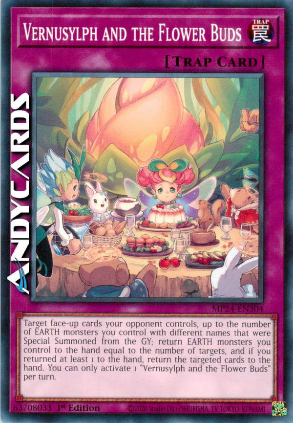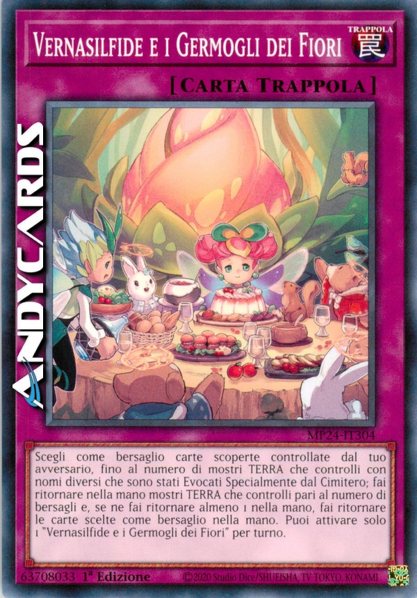 Scegli come bersaglio carte scoperte controllate dal tuo avversario, fino al numero di mostri TERRA che controlli con nomi diversi che sono stati Evocati Specialmente dal Cimitero; fai ritornare nella mano mostri TERRA che controlli pari al numero di bersagli e, se ne fai ritornare almeno 1 nella mano, fai ritornare le carte scelte come bersaglio nella mano. Puoi attivare solo 1 "Vernasilfide e i Germogli dei Fiori" per turno.