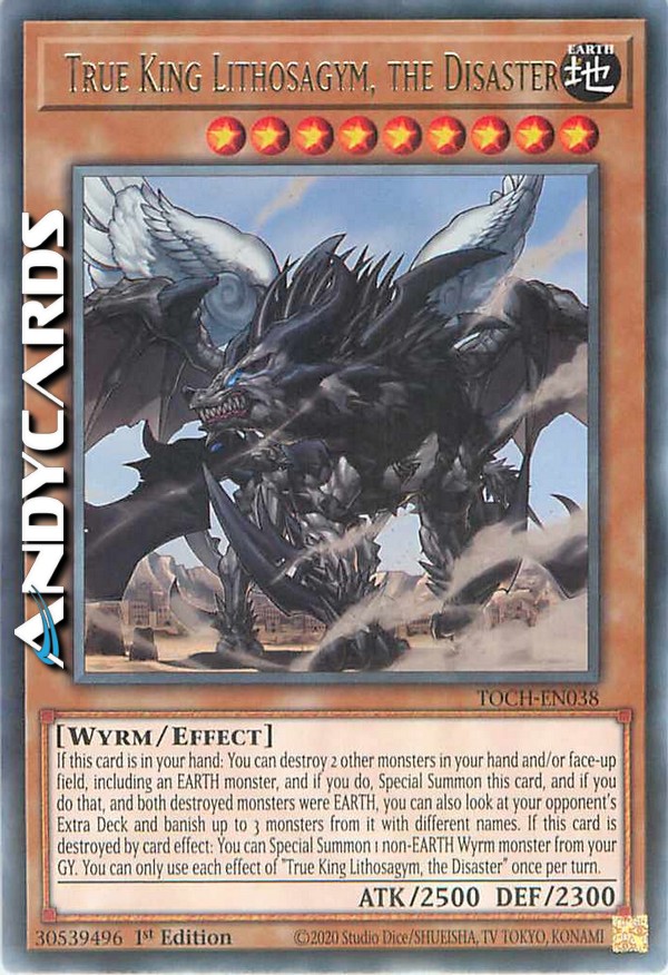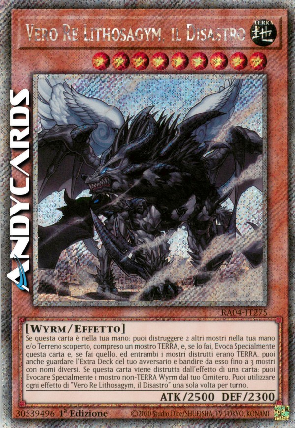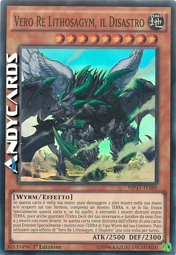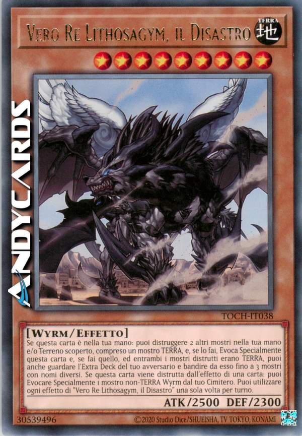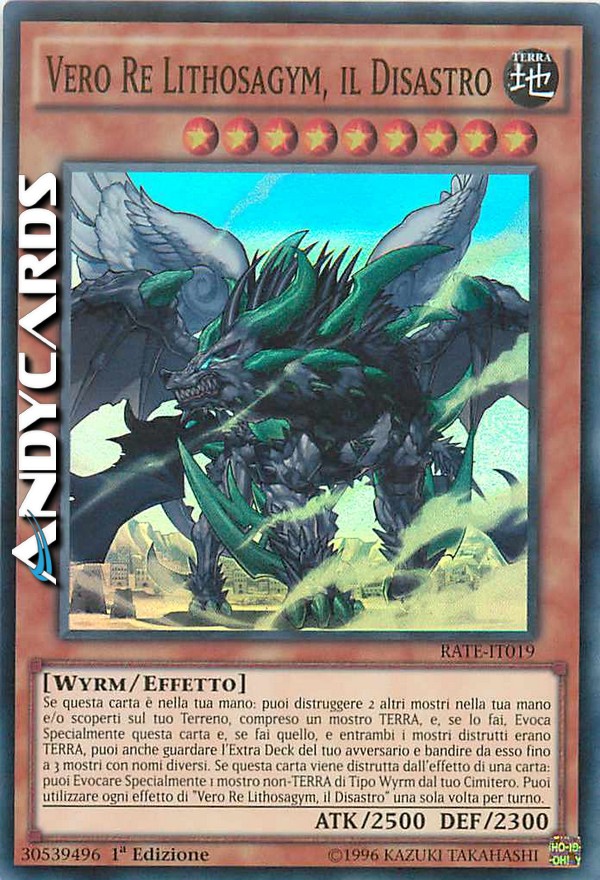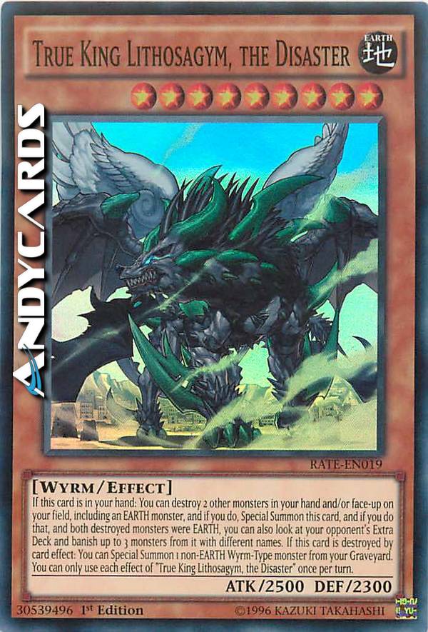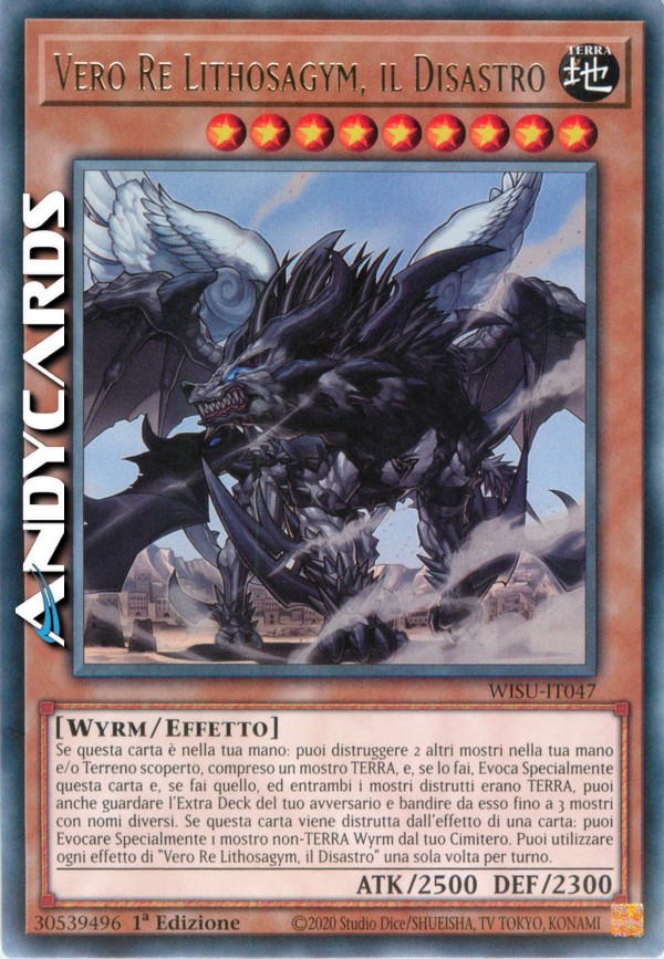 Se questa carta è nella tua mano: puoi distruggere 2 altri mostri nella tua mano e/o scoperti sul tuo Terreno, compreso un mostro TERRA, e, se lo fai, Evoca Specialmente questa carta e, se fai quello, e entrambi i mostri distrutti erano TERRA, puoi anche guardare l'Extra Deck del tuo avversario e bandire da esso fino a 3 mostri con nomi diversi. Se questa carta viene distrutta dall'effetto di una carta: puoi Evocare Specialmente 1 mostro non-TERRA di Tipo Wyrm dal tuo Cimitero. Puoi utilizzare ogni effetto di "Vero Re Lithosagym, il Disastro" una sola volta per turno.