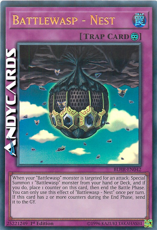 When your "Battlewasp" monster is targeted for an attack: Special Summon 1 "Battlewasp" monster from your hand or Deck, and if you do, place 1 counter on this card, then end the Battle Phase. You can only use this effect of "Battlewasp - Nest" once per turn. If this card has 2 or more counters during the End Phase, send it to the GY.