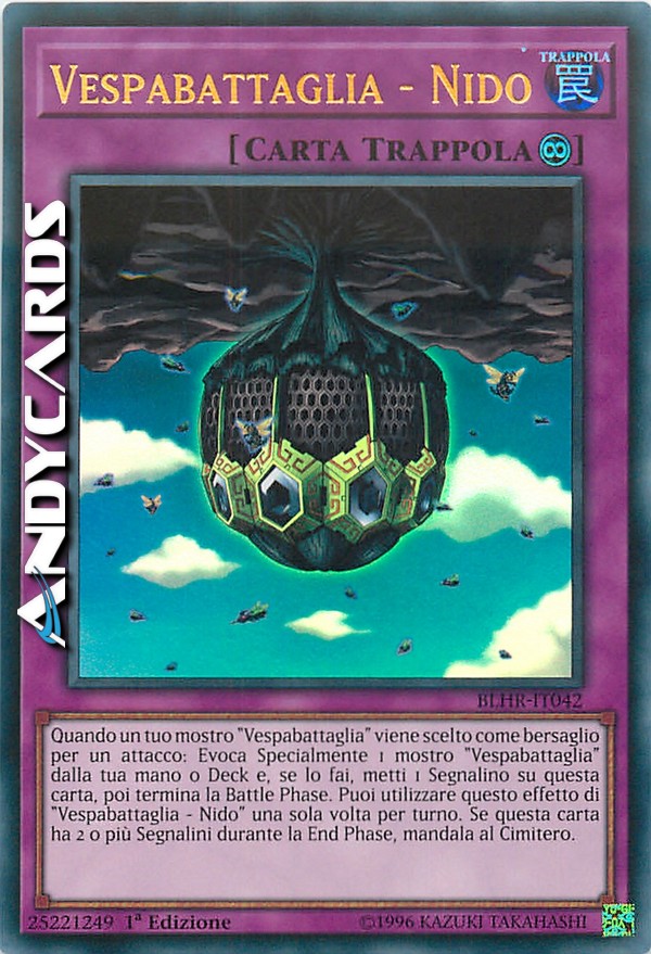 Quando un tuo mostro "Vespabattaglia" viene scelto come bersaglio per un attacco: Evoca Specialmente 1 mostro "Vespabattaglia" dalla tua mano o Deck e, se lo fai, metti 1 Segnalino su questa carta, poi termina la Battle Phase. Puoi utilizzare questo effetto di "Vespabattaglia - Nido" una sola volta per turno. Se questa carta ha 2 o più Segnalini durante la End Phase, mandala al Cimitero.