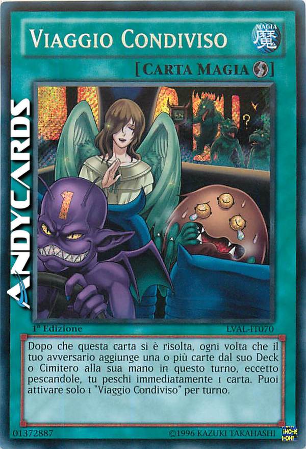 Dopo che questa carta si è risolta, ogni volta che il tuo avversario aggiunge una o più carte dal suo Deck o Cimitero alla sua mano in questo turno con l'effetto di una carta, eccetto pescandole, tu peschi immediatamente 1 carta per ogni effetto di carta. Puoi attivare solo 1 "Viaggio Condiviso" per turno.