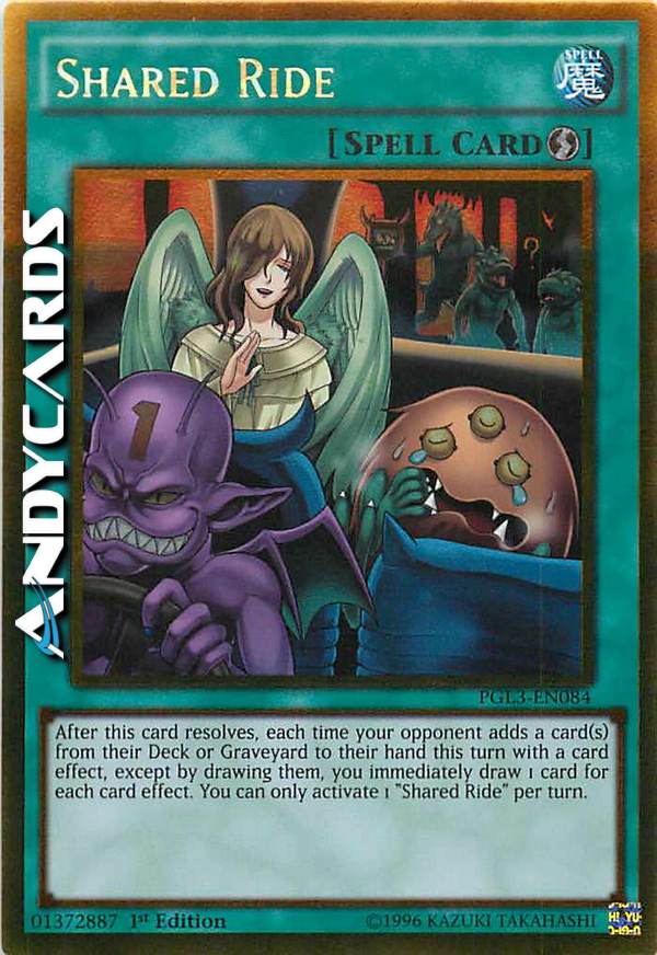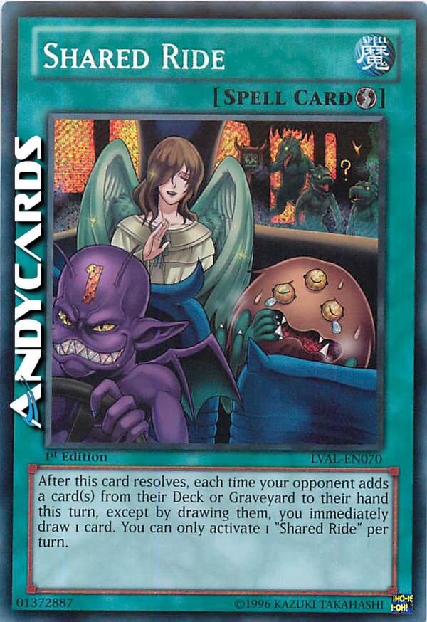 After this card resolves, each time your opponent adds a card(s) from their Deck or Graveyard to their hand this turn, except by drawing them, you immediately draw 1 card. You can only activate 1 "Shared Ride" per turn.