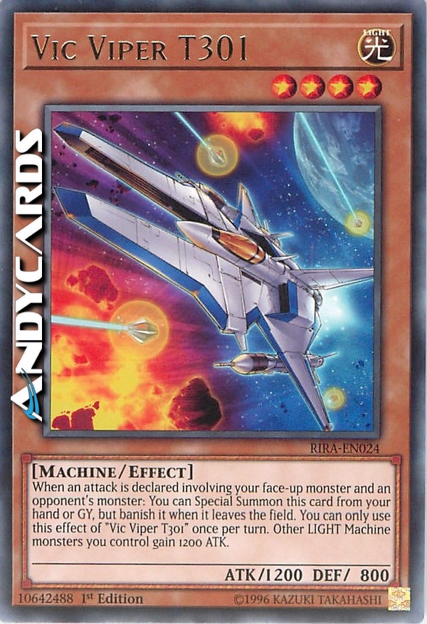 Quando viene dichiarato un attacco che coinvolge un tuo mostro scoperto e un mostro dell'avversario: puoi Evocare Specialmente questa carta dalla tua mano o Cimitero, ma bandiscila quando lascia il Terreno. Puoi utilizzare questo effetto di "Vic Viper T301" una sola volta per turno. Gli altri mostri LUCE Macchina che controlli guadagnano 1200 ATK.
