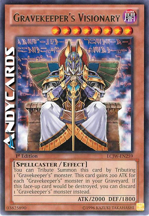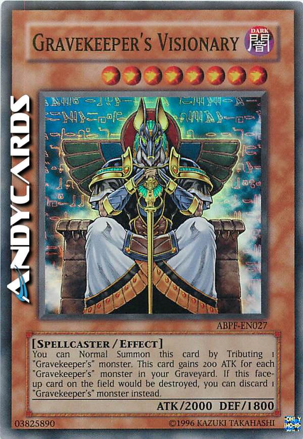 You can Normal Summon this card by Tributing 1 "Gravekeeper's" monster. This card gains 200 ATK for each "Gravekeeper's" monster in your Graveyard. If this face-up card on the field would be destroyed, you can discard 1 "Gravekeeper's" monster instead.