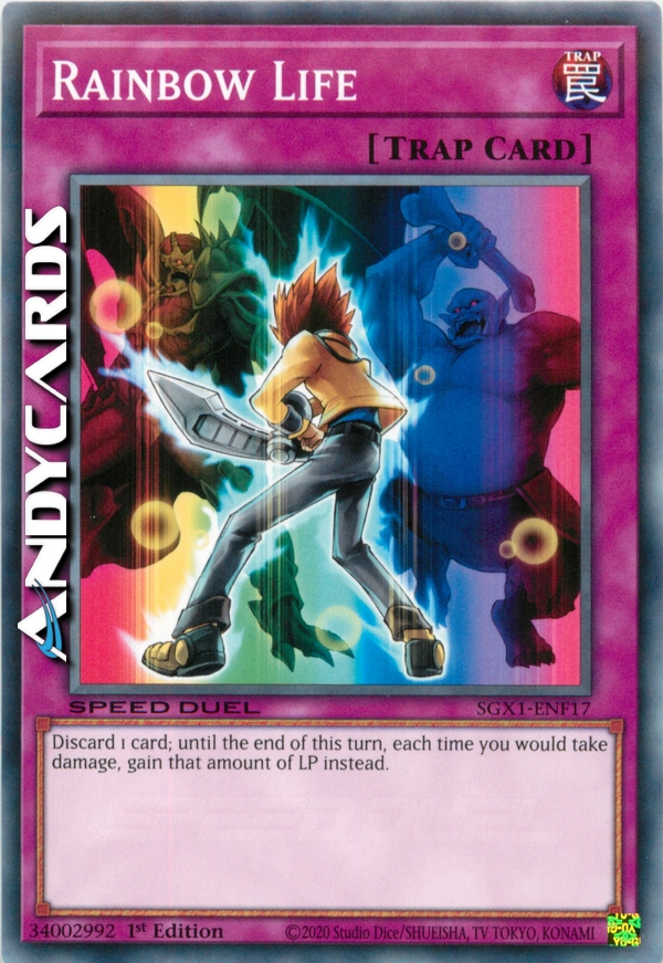 Scarta 1 carta dalla tua mano. Fino alla fine di questo turno, quando dovresti ricevere del danno, guadagna invece un pari ammontare di Life Points.
