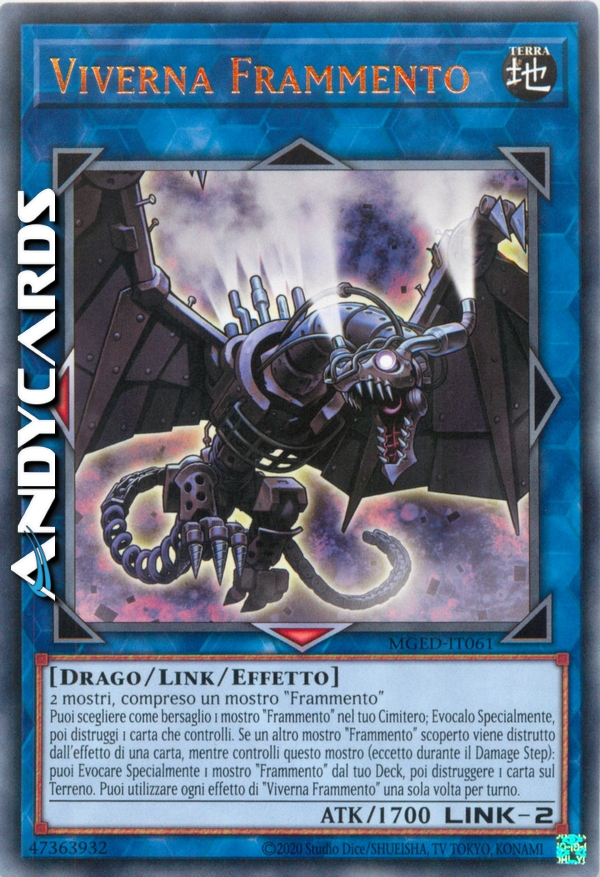 Puoi scegliere come bersaglio 1 mostro "Frammento" nel tuo Cimitero; Evocalo Specialmente, poi distruggi 1 carta che controlli. Se un altro mostro "Frammento" scoperto viene distrutto dall'effetto di una carta, mentre controlli questo mostro (eccetto durante il Damage Step): puoi Evocare Specialmente 1 mostro "Frammento" dal tuo Deck, poi distruggere 1 carta sul Terreno. Puoi utilizzare ogni effetto di "Viverna Frammento" una sola volta per turno.