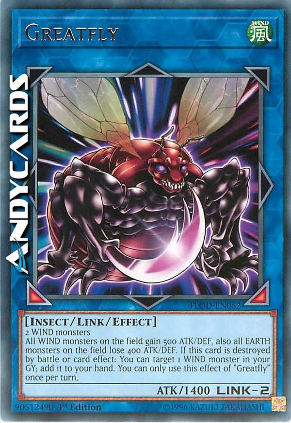 All WIND monsters on the field gain 500 ATK/DEF, also all EARTH monsters on the field lose 400 ATK/DEF. If this card is destroyed by battle or card effect: You can target 1 WIND monster in your GY; add it to your hand. You can only use this effect of "Greatfly" once per turn.