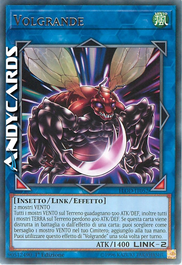 Tutti i mostri VENTO sul Terreno guadagnano 500 ATK/DEF, inoltre tutti i mostri TERRA sul Terreno perdono 400 ATK/DEF. Se questa carta viene distrutta in battaglia o dall'effetto di una carta: puoi scegliere come bersaglio 1 mostro VENTO nel tuo Cimitero; aggiungilo alla tua mano. Puoi utilizzare questo effetto di "Volgrande" una sola volta per turno.