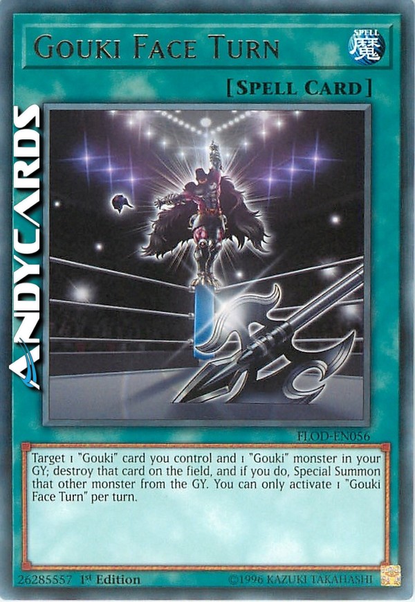 Target 1 "Gouki" card you control and 1 "Gouki" monster in your GY; destroy that card on the field, and if you do, Special Summon that other monster from the GY. You can only activate 1 "Gouki Face Turn" per turn.