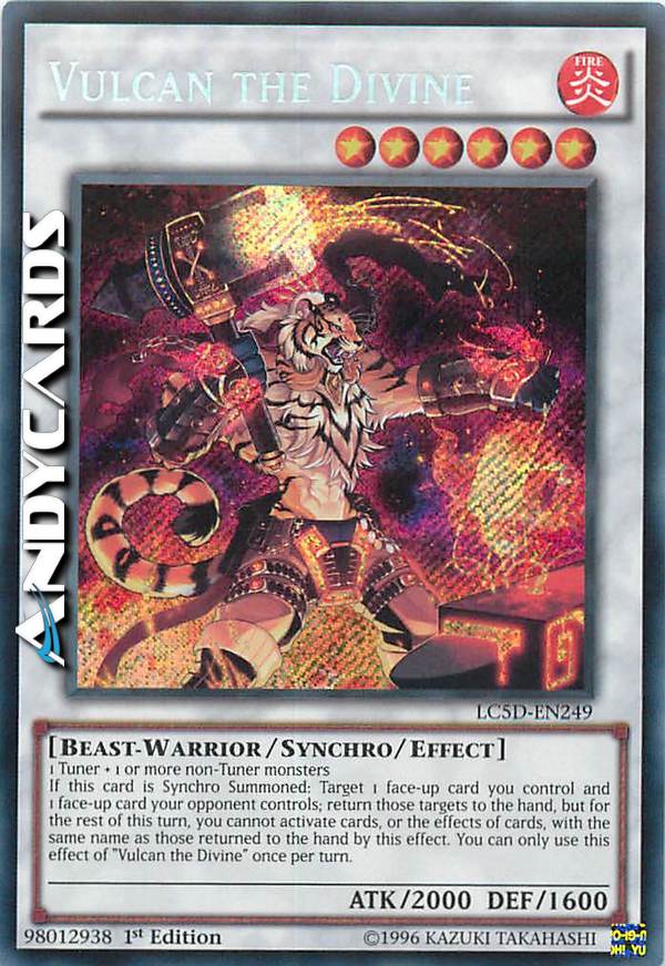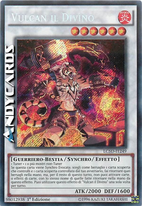 1 Tuner + 1 o più mostri non-Tuner Se questa carta viene Synchro Evocata: scegli come bersaglio 1 carta scoperta che controlli e 1 carta scoperta controllata dal tuo avversario; fai ritornare quei bersagli nella mano, ma, per il resto di questo turno, non puoi attivare carte, o effetti di carte, con lo stesso nome di quelle fatte ritornare nella mano da questo effetto. Puoi utilizzare questo effetto di "Vulcan il Divino" una sola volta per turno.