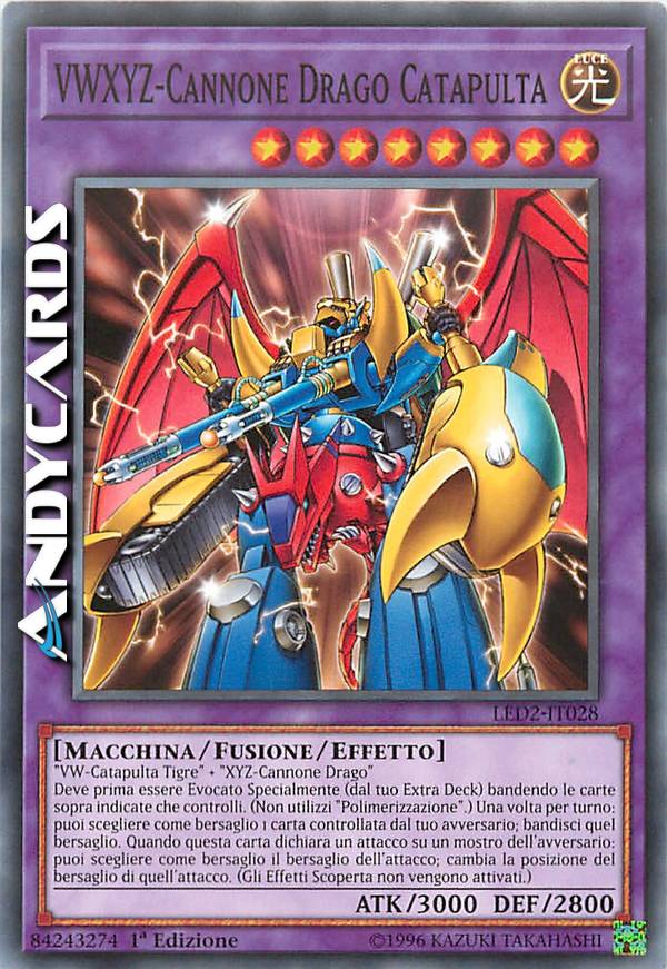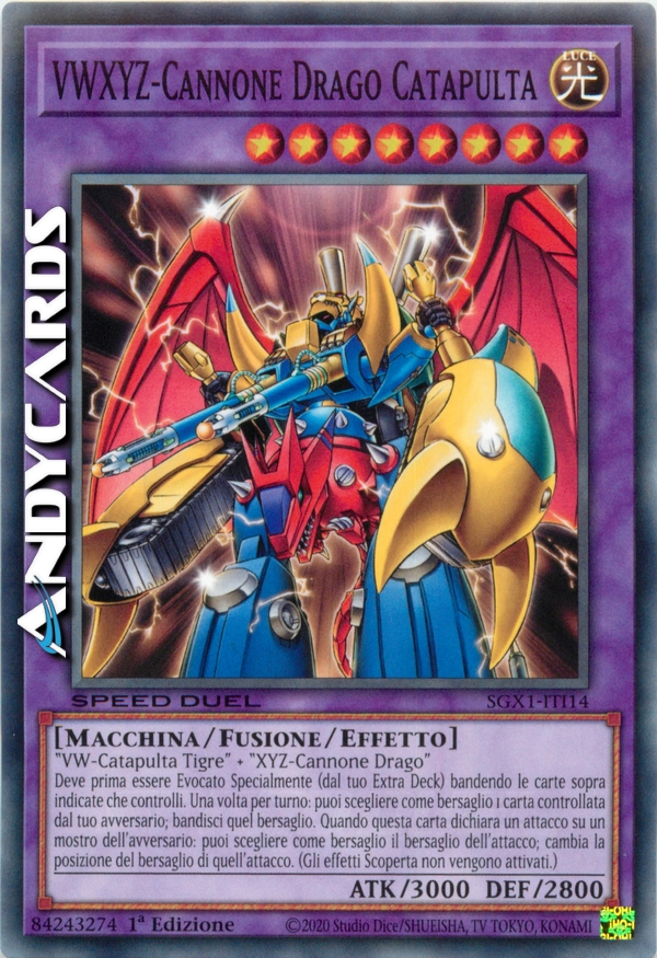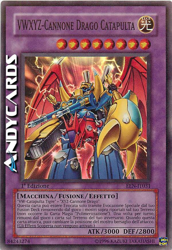 "VW CATAPULTA TIGRE" "XYZ CCANNONE DRAGO" . Questa carta può essere evocata solo tramite evocazione speciale dal tuo Fusion Deck rimuovendo dal gioco i mostri sopra riportati sul tuo terreno (non occorre la carta magia Polimerizzazione). Una volta per turno rimuovi dal gioco 1 carta sul terreno del tuo avversario. Quando questa Carta attacca, puoi cambiare la posizione del mostro bersaglio dell'attacco. (Gli effetti SCOPERTA non vengono attivati).