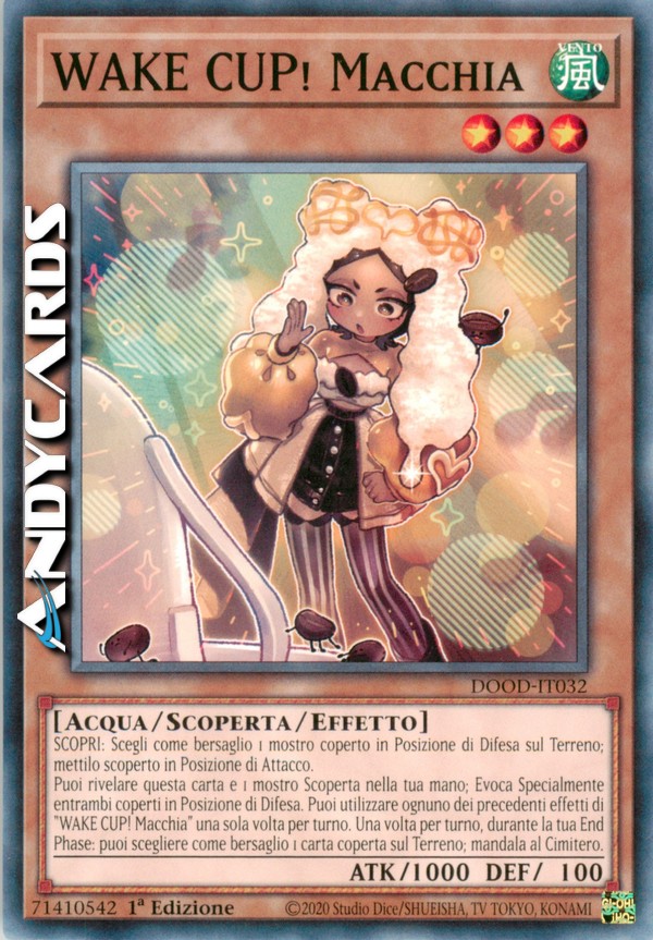 Puoi rivelare questa carta e 1 mostro Scoperta nella tua mano; Evoca Specialmente entrambi coperti in Posizione di Difesa. Puoi utilizzare ognuno dei precedenti effetti di "WAKE CUP! Macchia" una sola volta per turno. Una volta per turno, durante la tua End Phase: puoi scegliere come bersaglio 1 carta coperta sul Terreno; mandala al Cimitero.