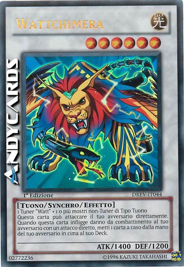1 tuner"watt"+1 o più mostri non-tuner di tipo tuono Questa carta può attaccare il tuo avversario direttamente.Quando questa carta infligge danno da combattimento al tuo avversario con un attacco diretto,metti 1 carta a caso dalla mano del tuo avversario in cima al suo deck.