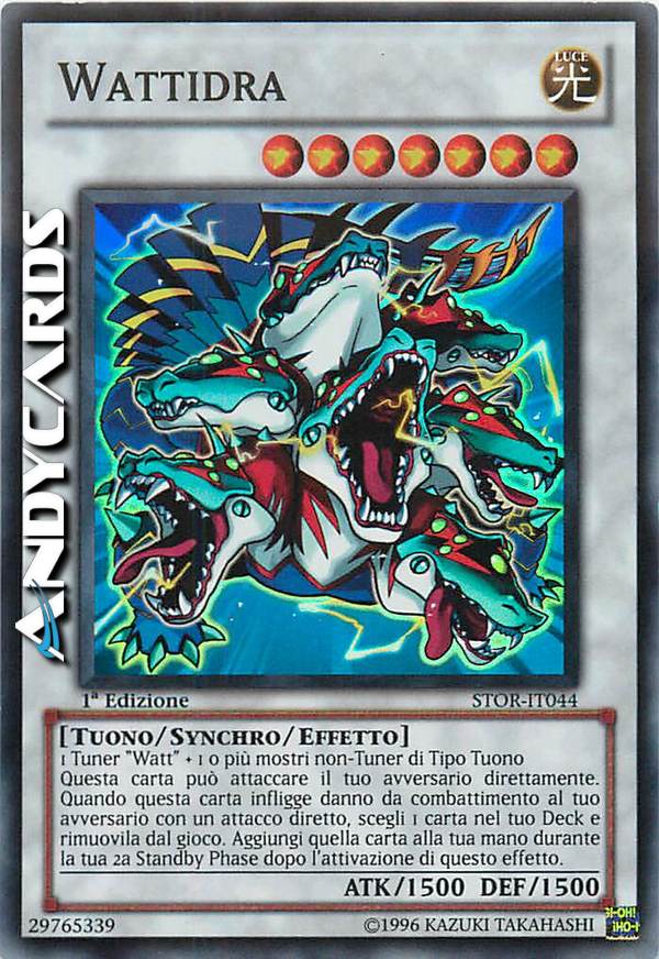1 Tuner "Watt" + 1 o più mostri non-Tuner di Tipo Tuono Questa carta può attaccare il tuo avversario direttamente. Quando questa carta infligge danno da combattimento al tuo avversario con un attacco diretto, scegli 1 carta nel tuo Deck e rimuovila dal gioco. Aggiungi quella carta alla tua mano durante la tua 2a Standby Phase dopo l'attivazione di questo effetto.