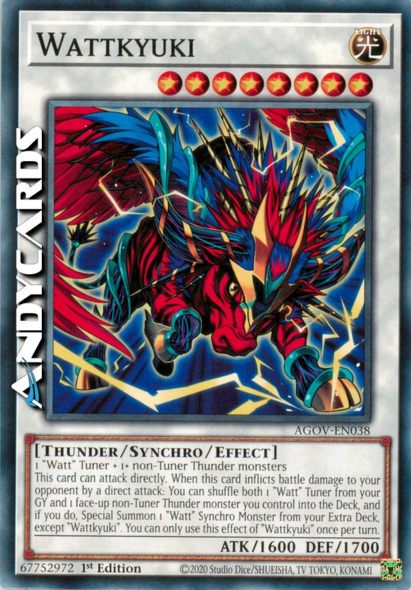 Questa carta può attaccare direttamente. Quando questa carta infligge danno da combattimento al tuo avversario con un attacco diretto: puoi mischiare sia 1 Tuner "Watt" dal tuo Cimitero che 1 mostro non-Tuner Tuono scoperto che controlli nel Deck e, se lo fai, Evoca Specialmente 1 Mostro Synchro "Watt" dal tuo Extra Deck, eccetto "Wattkyuki". Puoi utilizzare questo effetto di "Wattkyuki" una sola volta per turno.