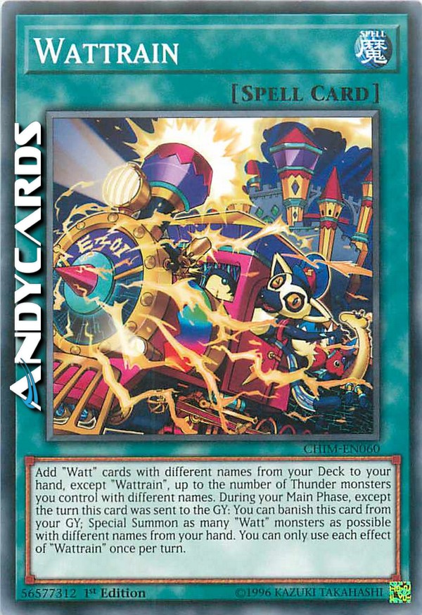 Add "Watt" cards with different names from your Deck to your hand, except "Wattrain", up to the number of Thunder monsters you control with different names. During your Main Phase, except the turn this card was sent to the GY: You can banish this card from your GY; Special Summon as many "Watt" monsters as possible with different names from your hand. You can only use each effect of "Wattrain" once per turn.