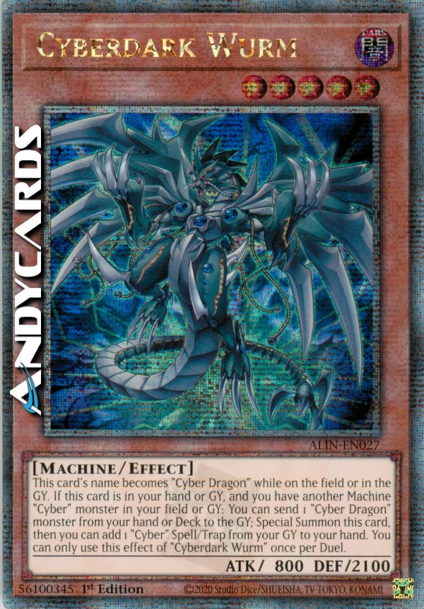 This card's name becomes "Cyber Dragon" while on the field or in the GY. If this card is in your hand or GY, and you have another Machine "Cyber" monster in your field or GY: You can send 1 "Cyber Dragon" monster from your hand or Deck to the GY; Special Summon this card, then you can add 1 "Cyber" Spell/Trap from your GY to your hand. You can only use this effect of "Cyberdark Wurm" once per Duel.