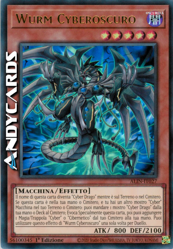 Il nome di questa carta diventa "Cyber Drago" mentre è sul Terreno o nel Cimitero. Se questa carta è nella tua mano o Cimitero, e tu hai un altro mostro "Cyber" Macchina nel tuo Terreno o Cimitero: puoi mandare 1 mostro "Cyber Drago" dalla tua mano o Deck al Cimitero; Evoca Specialmente questa carta, poi puoi aggiungere 1 Magia/Trappola "Cyber" o "Cibernetico" dal tuo Cimitero alla tua mano. Puoi utilizzare questo effetto di "Wurm Cyberoscuro" una sola volta per Duello.