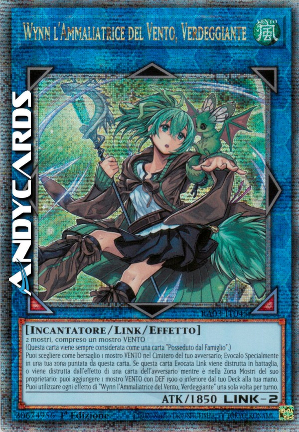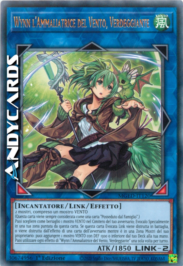 Puoi scegliere come bersaglio 1 mostro VENTO nel Cimitero del tuo avversario; Evocalo Specialmente in una tua zona puntata da questa carta. Se questa carta Evocata Link viene distrutta in battaglia, o viene distrutta dall'effetto di una carta dell'avversario mentre è in una Zona Mostri del suo proprietario: puoi aggiungere 1 mostro VENTO con DEF 1500 o inferiore dal tuo Deck alla tua mano. Puoi utilizzare ogni effetto di "Wynn l'Ammaliatrice del Vento, Verdeggiante" una sola volta per turno.