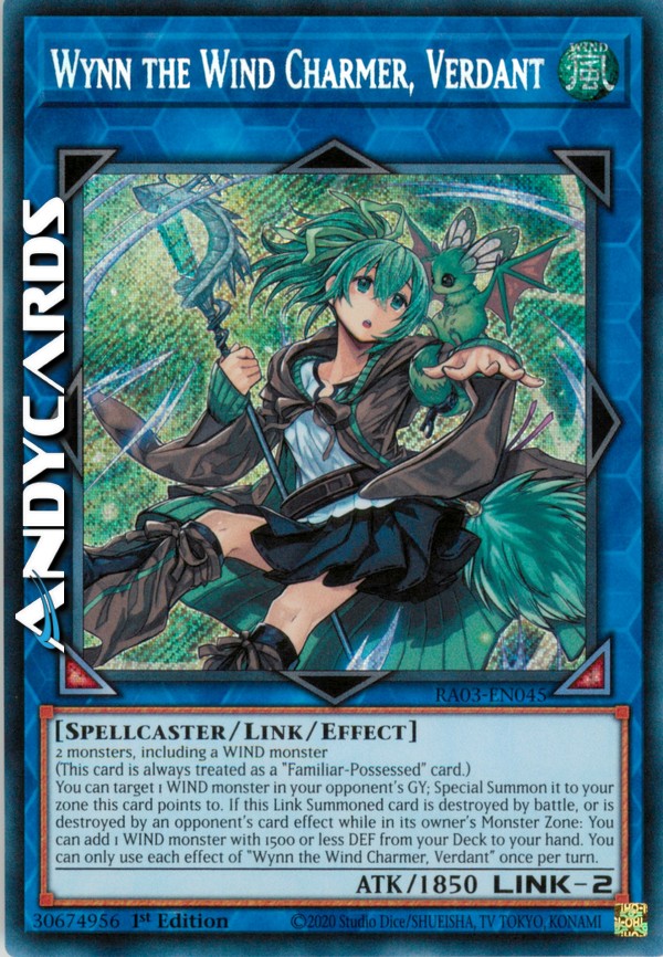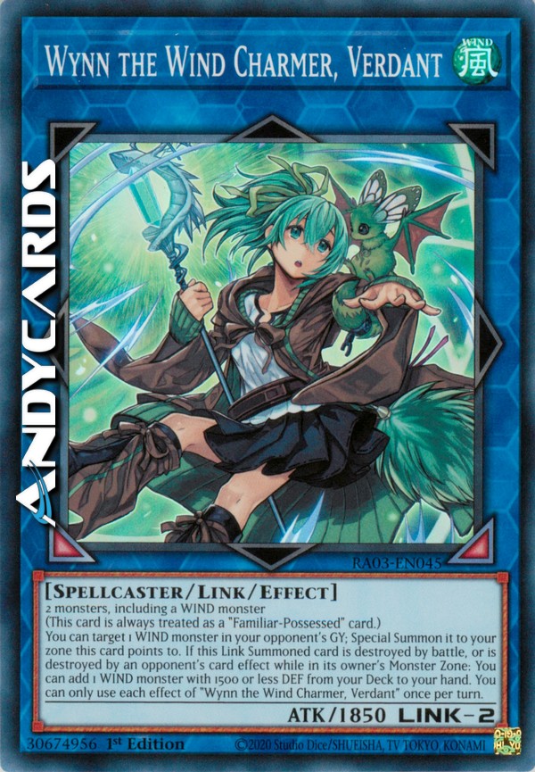 You can target 1 WIND monster in your opponent's GY; Special Summon it to your zone this card points to. If this Link Summoned card is destroyed by battle, or is destroyed by an opponent's card effect while in its owner's Monster Zone: You can add 1 WIND monster with 1500 or less DEF from your Deck to your hand. You can only use each effect of "Wynn the Wind Charmer, Verdant" once per turn.