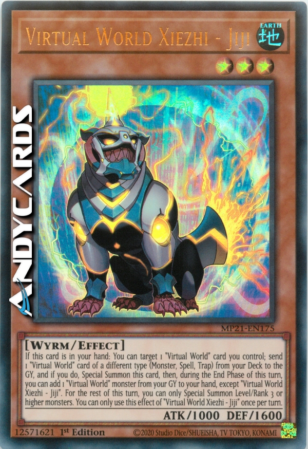 Se questa carta è nella tua mano: puoi scegliere come bersaglio 1 carta "Mondo Virtuale" che controlli; manda 1 carta "Mondo Virtuale" di un tipo diverso (Mostro, Magia, Trappola) dal tuo Deck al Cimitero e, se lo fai, Evoca Specialmente questa carta, poi, durante la End Phase di questo turno, puoi aggiungere 1 mostro "Mondo Virtuale" dal tuo Cimitero alla tua mano, eccetto "Xiezhi Mondo Virtuale - Jiji". Per il resto di questo turno, puoi Evocare Specialmente solo mostri di Livello/Rango 3 o superiore. Puoi utilizzare questo effetto di "Xiezhi Mondo Virtuale - Jiji" una sola volta per turno.