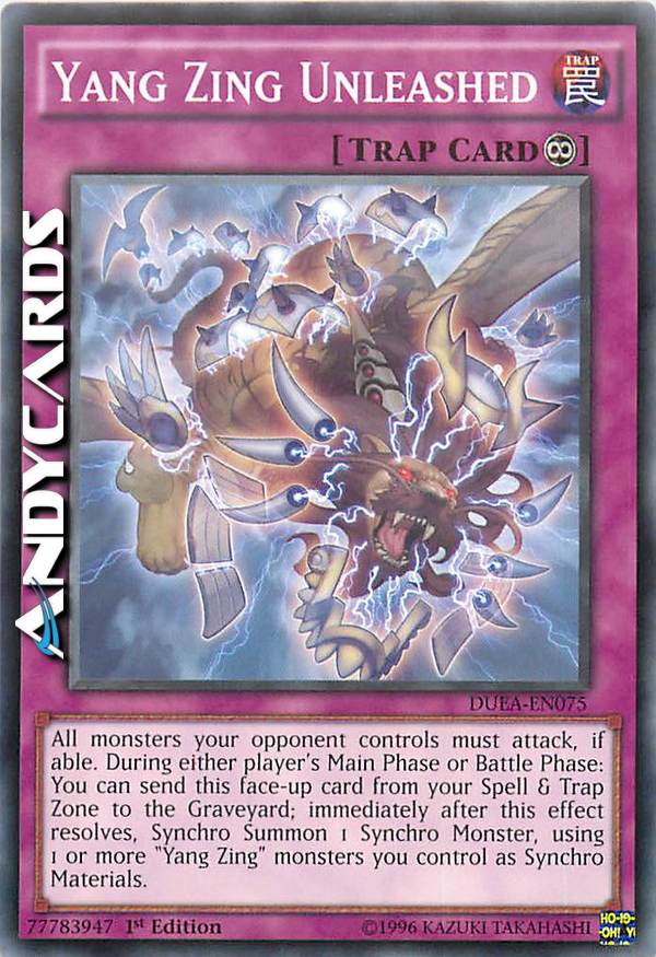Tutti i mostri controllati dal tuo avversario devono attaccare, se possibile. Durante la Main Phase o Battle Phase di qualsiasi giocatore: puoi mandare questa carta scoperta dalla tua Zona Magie e trappole al Cimitero; immediatamente dopo che questo effetto si è risolto, Synchro Evoca 1 Mostro Synchro, utilizzando 1 o più mostri "Yang Zing" che controlli come Materiali Synchro.