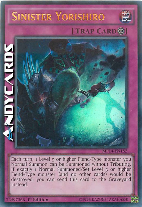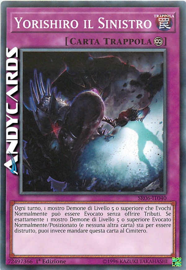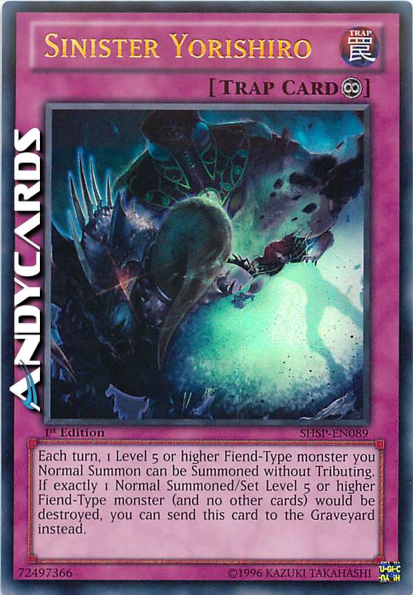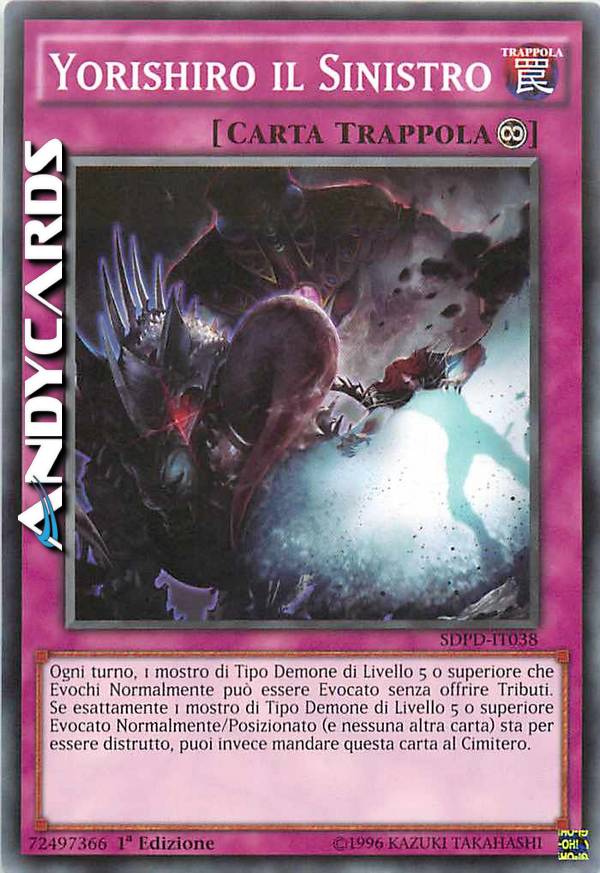 Ogni turno, 1 mostro di Tipo demone di Livello 5 o superiore che Evochi Normalmente può essere Evocato senza offrire Tributi. Se esattamente 1 mostro di Tipo Demone di Livello 5 o superiore Evocato Normalmente/Posizionato (e nessuna altra carta) sta per essere distrutto, puoi invece mandare questa carta al Cimitero.