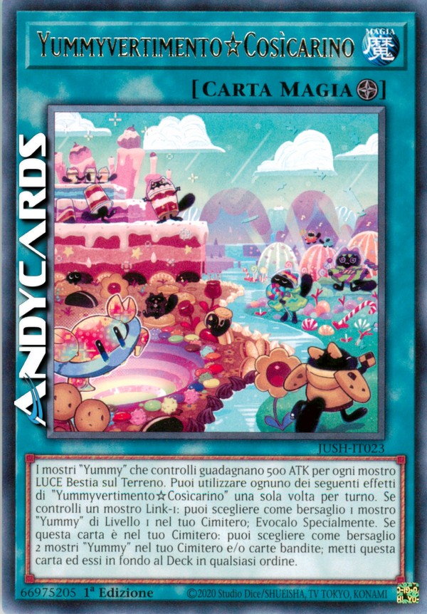I mostri "Yummy" che controlli guadagnano 500 ATK per ogni mostro LUCE Bestia sul Terreno. Puoi utilizzare ognuno dei seguenti effetti di "Yummyvertimento☆Cosìcarino" una sola volta per turno. Se controlli un mostro Link-1: puoi scegliere come bersaglio 1 mostro "Yummy" di Livello 1 nel tuo Cimitero; Evocalo Specialmente. Se questa carta è nel tuo Cimitero: puoi scegliere come bersaglio 2 mostri "Yummy" nel tuo Cimitero e/o carte bandite; metti questa carta ed essi in fondo al Deck in qualsiasi ordine.