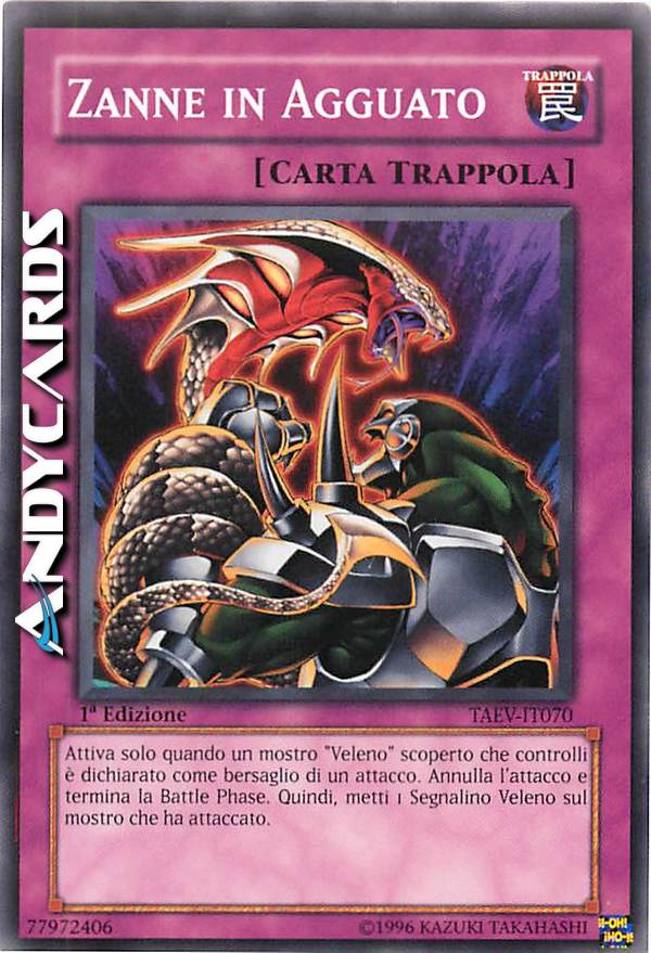 Attiva solo quando un mostro "Veleno" scoperto che controlli è dichiarato come bersaglio di un attacco. Annulla l'attacco e termina la Battle Phase. Quindi, metti 1 Segnalino Veleno sul mostro che ha attaccato.