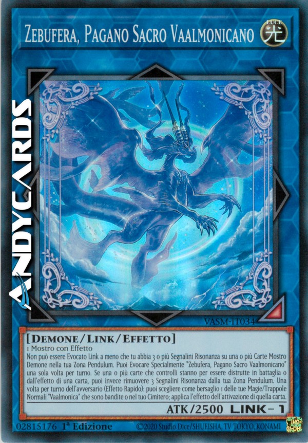 Non può essere Evocato Link a meno che tu abbia 3 o più Segnalini Risonanza su una o più Carte Mostro Demone nella tua Zona Pendulum. Puoi Evocare Specialmente "Zebufera, Pagano Sacro Vaalmonicano" una sola volta per turno. Se una o più carte che controlli stanno per essere distrutte in battaglia o dall'effetto di una carta, puoi invece rimuovere 3 Segnalini Risonanza dalla tua Zona Pendulum. Una volta per turno dell'avversario (Effetto Rapido): puoi scegliere come bersaglio 1 delle tue Magie/Trappole Normali "Vaalmonica" che sono bandite o nel tuo Cimitero; applica l'effetto dell'attivazione di quella carta.