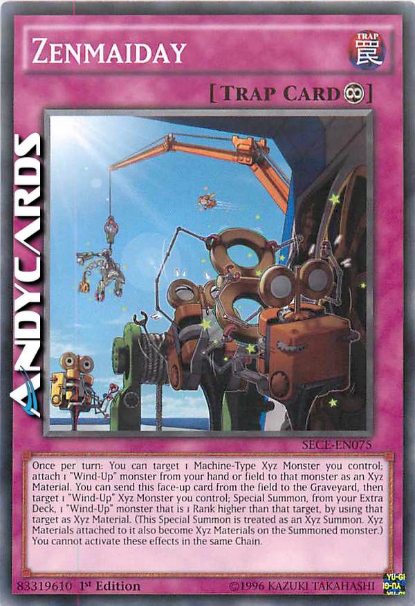 Once per turn: You can target 1 Machine-Type Xyz Monster you control; attach 1 "Wind-Up" monster from your hand or field to that monster as an Xyz Material. You cansend this face-up card from the field to the Graveyard, then target 1 "Wind-Up" Xyz Monster you control; Special Summon, from your Extra Deck, 1 "Wind-Up" monster that is 1 Rank higher than that target, by using that target as Xyz Material. (This Special Summon is treated as an Xyz Summon. Xyz Materials attached to it also become Xyz Materials on the Summoned monster.) You cannot activate these effects in the same chain.