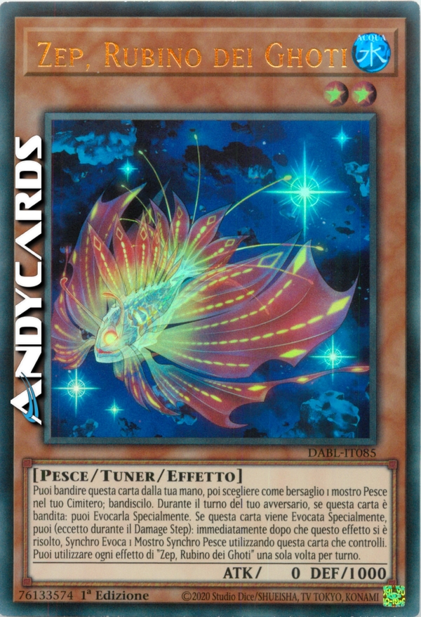 Puoi bandire questa carta dalla tua mano, poi scegliere come bersaglio 1 mostro Pesce nel tuo Cimitero; bandiscilo. Durante il turno del tuo avversario, se questa carta è bandita: puoi Evocarla Specialmente. Se questa carta viene Evocata Specialmente, puoi (eccetto durante il Damage Step): immediatamente dopo che questo effetto si è risolto, Synchro Evoca 1 Mostro Synchro Pesce utilizzando questa carta che controlli. Puoi utilizzare ogni effetto di "Zep, Rubino dei Ghoti" una sola volta per turno.
