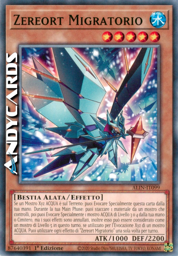 Se un Mostro Xyz ACQUA è sul Terreno: puoi Evocare Specialmente questa carta dalla tua mano. Durante la tua Main Phase: puoi staccare 1 materiale da un mostro che controlli, poi puoi Evocare Specialmente 1 mostro ACQUA di Livello 3 o 4 dalla tua mano o Cimitero, ma i suoi effetti sono annullati, inoltre esso può essere considerato come un mostro di Livello 5 in questo turno, se utilizzato per l'Evocazione Xyz di un mostro ACQUA. Puoi utilizzare ogni effetto di "Zereort Migratorio" una sola volta per turno.