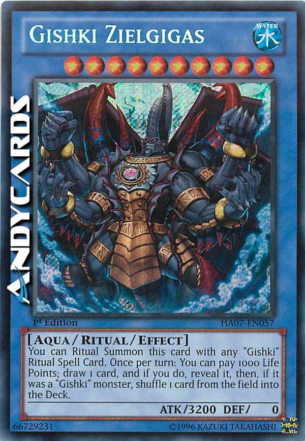 You can Ritual Summon this card with any "Gishki" Ritual Spell Card. Once per turn: You can pay 1000 Life Points; draw 1 card and reveal it, then, if it was a "Gishki" monster, shuffle 1 card from the field into the Deck.