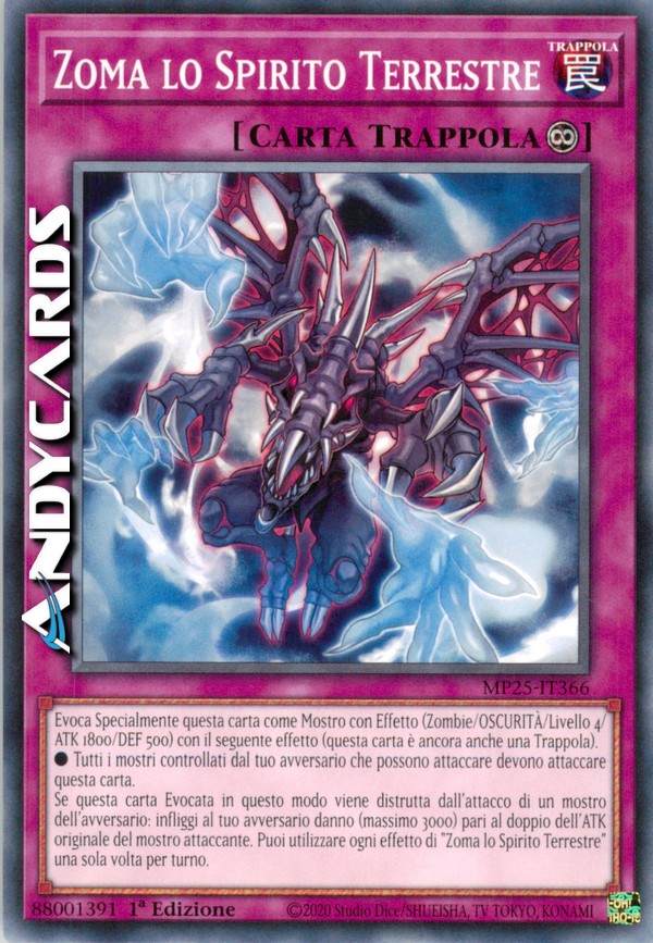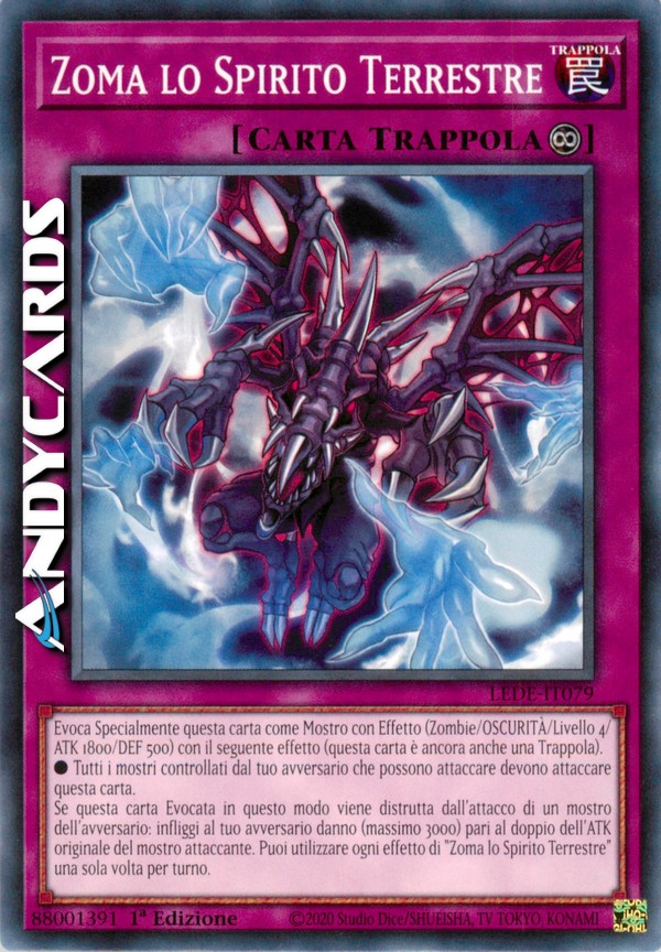 Se questa carta Evocata in questo modo viene distrutta dall'attacco di un mostro dell'avversario: infliggi al tuo avversario danno (massimo 3000) pari al doppio dell'ATK originale del mostro attaccante. Puoi utilizzare ogni effetto di "Zoma lo Spirito Terrestre" una sola volta per turno.