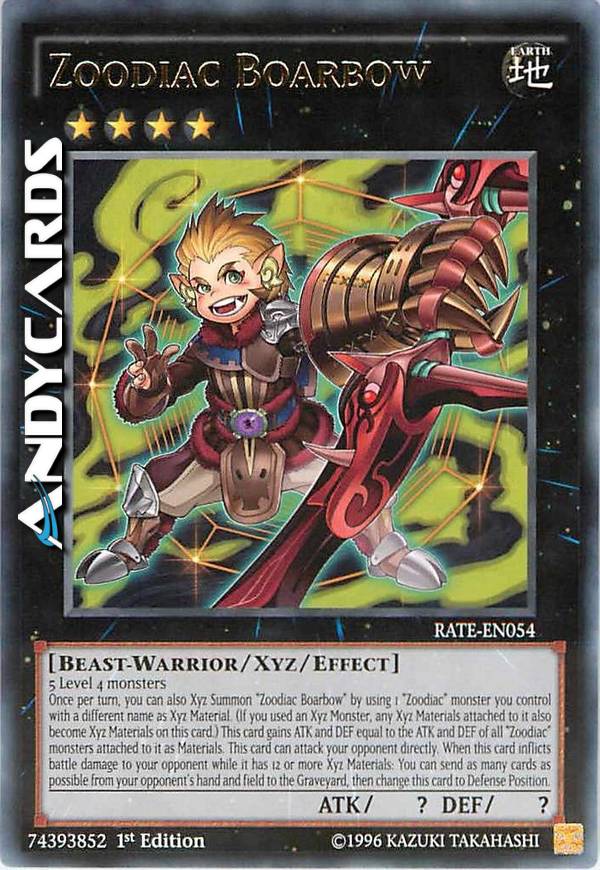 Once per turn, you can also Xyz Summon "Zoodiac Boarbow" by using 1 "Zoodiac" monster you control with a different name as material. (Transfer its materials to this card.) Gains ATK/DEF equal to the ATK/DEF of all "Zoodiac" monsters attached to it as material. This card can attack directly. When this card inflicts battle damage to your opponent while it has 12 or more materials: You can send as many cards as possible from your opponent's hand and field to the GY, then change this card to Defense Position.