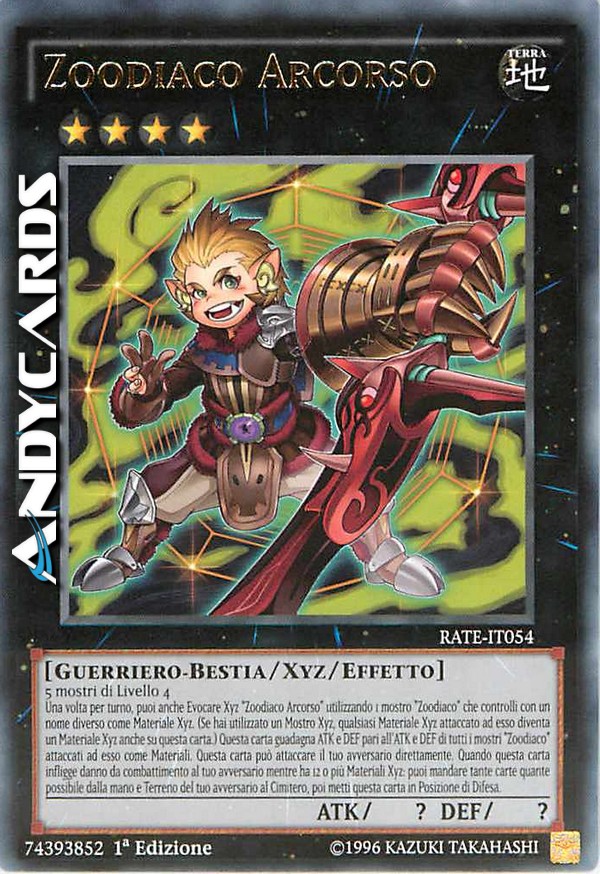5 mostri di Livello 4 - Una volta per turno, puoi anche Evocare Xyz "Zoodiaco Arcorso" utilizzando 1 mostro "Zoodiaco" che controlli con un nome diverso come Materiale Xyz. (Se hai utilizzato un Mostro Xyz, qualsiasi Materiale Xyz attaccato ad esso diventa un Materiale Xyz anche su questa carta.) Questa carta guadagna ATK e DEF pari all'ATK e DEF di tutti i mostri "Zoodiaco" attaccati ad esso come Materiali. Questa carta può attaccare il tuo avversario direttamente. Quando questa carta infligge danno da combattimento al tuo avversario mentre ha 12 o più Materiali Xyz: puoi mandare tante carte quante possibile dalla mano e Terreno del tuo avversario al Cimitero, poi metti questa carta in Posizione di Difesa.