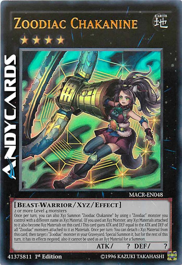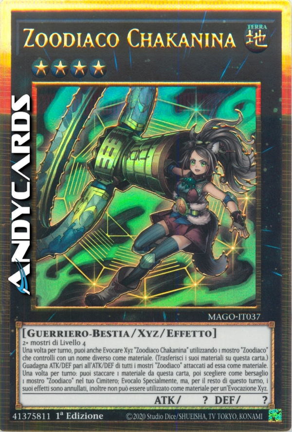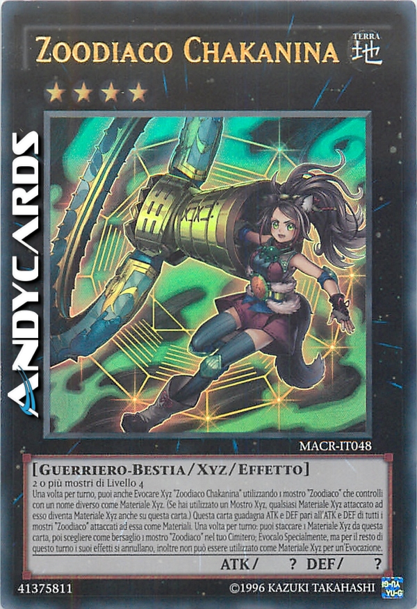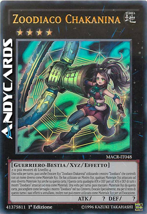 2 o più mostri di Livello 4 - Una volta per turno, puoi anche Evocare Xyz "Zoodiaco Chakanina" utilizzando 1 mostro "Zoodiaco" che controlli con un nome diverso come Materiale Xyz. (Se hai utilizzato un Mostro Xyz, qualsiasi Materiale Xyz attaccato ad esso diventa Materiale Xyz anche su questa carta.) Questa carta guadagna ATK e DEF pari all'ATK e DEF di tutti i mostri "Zoodiaco" attaccati ad essa come Materiali. Una volta per turno: puoi staccare 1 Materiale Xyz da questa carta, poi scegliere come bersaglio 1 mostro "Zoodiaco" nel tuo Cimitero; Evocalo Specialmente, ma per il resto di questo turno i suoi effetti si annullano, inoltre non può essere utilizzato come Materiale Xyz per un'Evocazione.