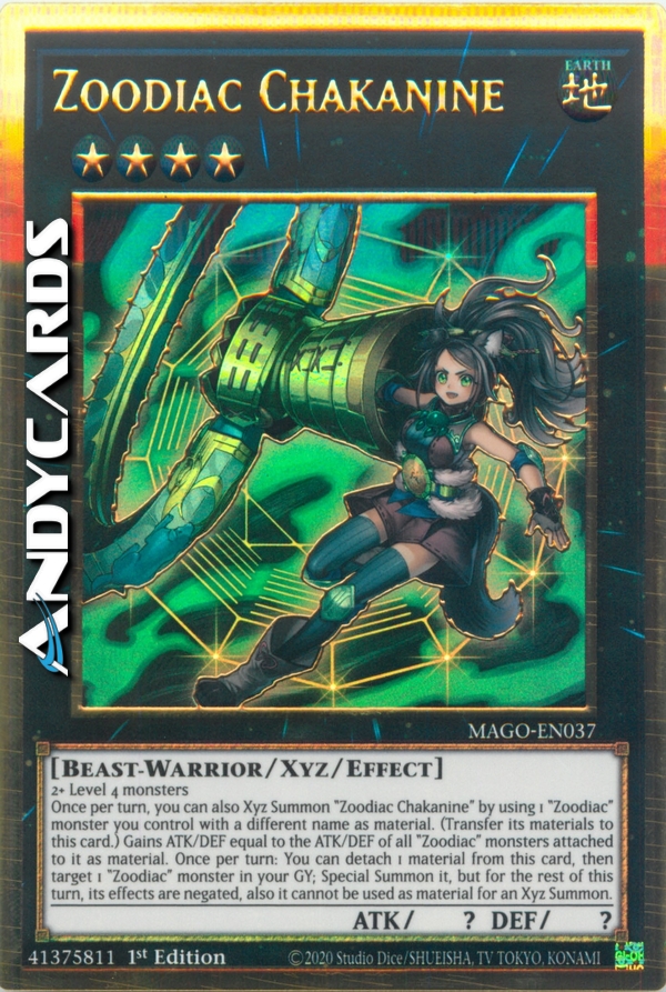 2 or more Level 4 monsters - Once per turn, you can also Xyz Summon "Zoodiac Chakanine" by using 1 "Zoodiac" monster you control with a different name as Xyz Material. (If you used an Xyz Monster, any Xyz Materials attached to it also become Xyz Materials on this card.) This card gains ATK and DEF equal to the ATK and DEF of all "Zoodiac" monsters attached to it as Materials. Once per turn: You can detach 1 Xyz Material from this card, then target 1 "Zoodiac" monster in your Graveyard; Special Summon it, but for the rest of this turn, it has its effects negated, also it cannot be used as an Xyz Material for a Summon.