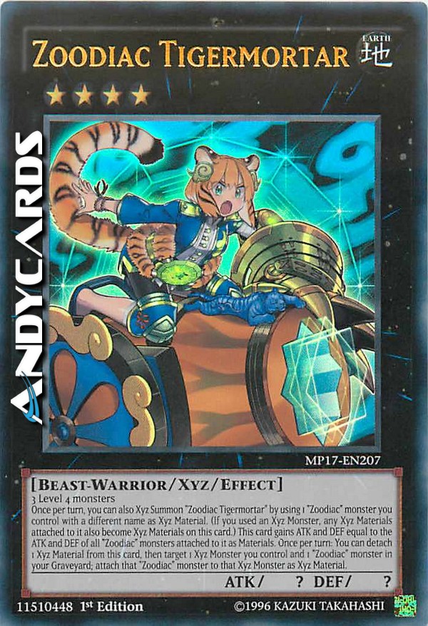 3 Level 4 monsters - Once per turn, you can also Xyz Summon "Zoodiac Tigermortar" by using 1 "Zoodiac" monster you control with a different name as Xyz Material. (If you used an Xyz Monster, any Xyz Materials attached to it also become Xyz Materials on this card.) This card gains ATK and DEF equal to the ATK and DEF of all "Zoodiac" monsters attached to it as Materials. Once per turn: You can detach 1 Xyz Material from this card, then target 1 Xyz Monster you control and 1 "Zoodiac" monster in your Graveyard; attach that "Zoodiac" monster to that Xyz Monster as Xyz Material.