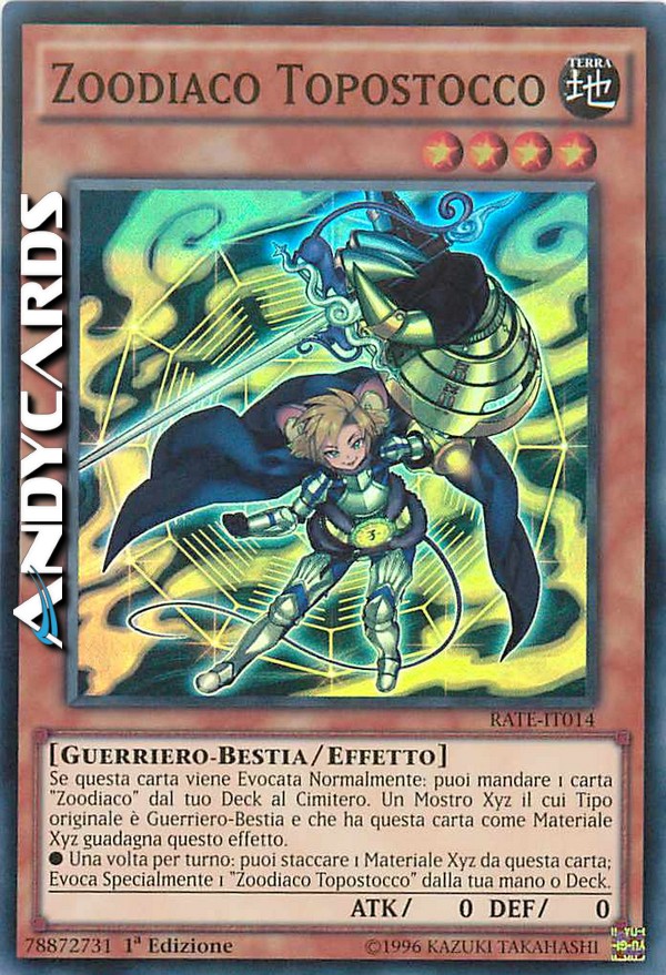Se questa carta viene Evocata Normalmente: puoi mandare 1 carta "Zoodiaco" dal tuo Deck al Cimitero. Un Mostro Xyz il cui Tipo originale è Guerriero-Bestia e che ha questa carta come Materiale Xyz guadagna questo effetto. - Una volta per turno: puoi staccare 1 Materiale Xyz da questa carta; Evoca Specialmente 1 "Zoodiaco Topostocco" dalla tua mano o Deck.