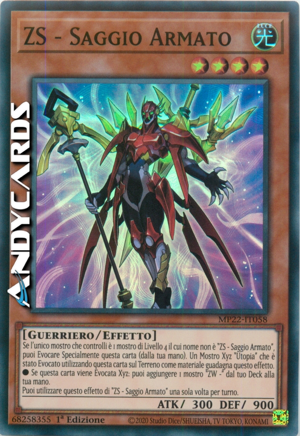 Se l'unico mostro che controlli è 1 mostro di Livello 4 il cui nome non è "ZS - Saggio Armato", puoi Evocare Specialmente questa carta (dalla tua mano). Un Mostro Xyz "Utopia" che è stato Evocato utilizzando questa carta sul Terreno come materiale guadagna questo effetto.