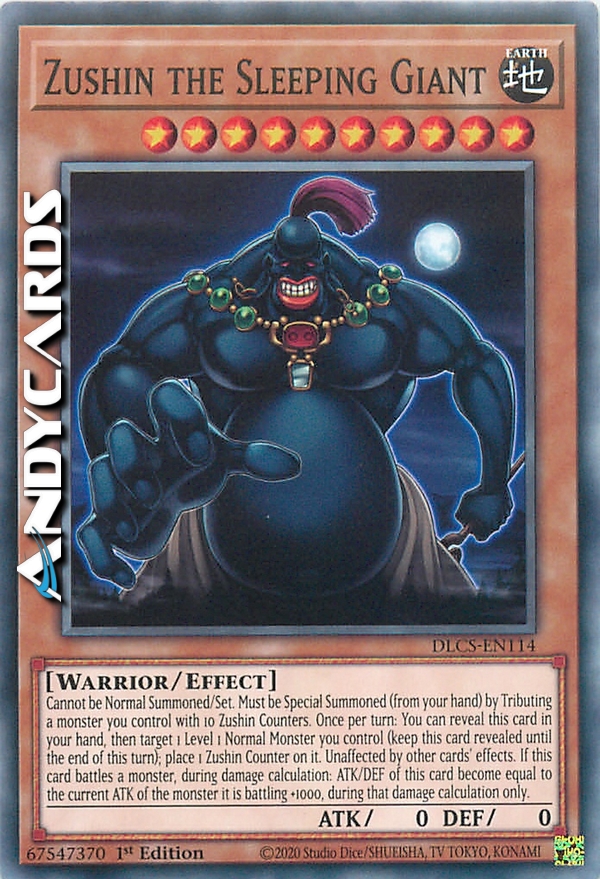 Non può essere Evocato Normalmente/Posizionato. Deve essere Evocato Specialmente (dalla tua mano) offrendo come Tributo un mostro che controlli con 10 Segnalini Zushin, e non può essere Evocato Specialmente in altri modi. Una volta per turno: puoi rivelare questa carta nella tua mano, poi scegliere come bersaglio 1 Mostro Normale di Livello 1 che controlli (mantieni questa carta rivelata fino alla fine di questo turno); metti 1 Segnalino Zushin su di esso. Immune agli effetti delle altre carte. Se questa carta combatte con un mostro, durante il calcolo dei danni: l'ATK e il DEF di questa carta diventano pari all'ATK attuale del mostro con cui sta combattendo +1000, solamente durante quel calcolo dei danni.