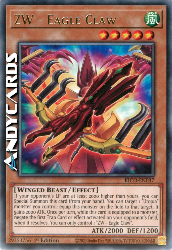 Se i Life Point del tuo avversario sono di almeno 2000 superiori ai tuoi, puoi Evocare Specialmente questa carta (dalla tua mano). Puoi scegliere come bersaglio 1 mostro "Utopia" che controlli; equipaggia questo mostro sul Terreno a quel bersaglio. Esso guadagna 2000 ATK. Una volta per turno, mentre questa carta è equipaggiata a un mostro, quando una Carta Trappola o l'effetto di una Trappola che è stato attivato sul Terreno del tuo avversario si risolve, annulla gli effetti di quella carta. Puoi controllare solo 1 "ZW - Aquila Artiglio".